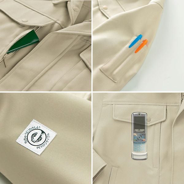 1、左右胸Wポケット 2、右胸内携帯ポケット 3、左袖ペン差し 4、右袖エコマーク 5、制電素材 6、リサイクル素材 7、裏綿素材 8、エコクリーン 裏綿 9、ECOPET |
