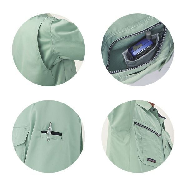 1、脇のツッパリを解消トリカットR 2、背中ノーフォーク 3、右胸ファスナー付ポケット 4、右胸ポケット内携帯電話ループ 5、右脇ポケット内にコインポケット 6、左胸ペン差し 7、左袖ペン差し 8、カフスWボタン 9、ファスナー/フロント:プラスチック(引き手 金属) ポケット:プラスチック(引き手 金属) 10、ボタン/金属 11、 胸ポケットマジックテープ仕様 12、男女兼用 13、トリカット 14、帯電防止素材 |