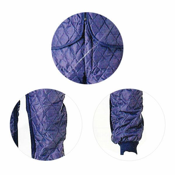 1、帯電防止織物使用 2、腰部後ろゴム仕様、裾口、股部ジャージ仕様 3、腰部前中央/ドットボタン(金属) 4、フロントファスナー/コイル(スライダー:金属) 5、防寒・保温 6、キルティング 7、バックスタイル |