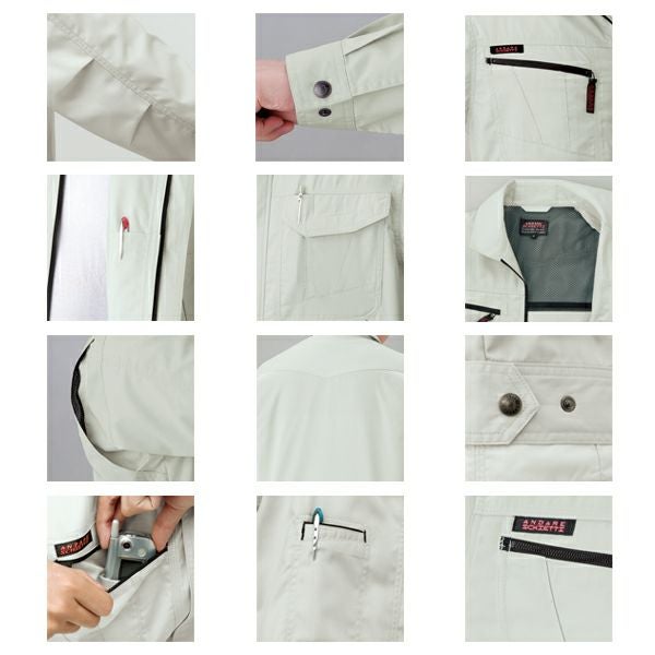 | 特徴 | 1、反射テープ 2、ウエスト脇ゴム 3、カラビナループ 4、超消臭テープ 5、スルポケ 6、着楽カット 7、カラビナループ&小物収納ポケット 8、男女兼用 9、JIS帯電防止規格合格 10、帯電防止素材使用 11、ストレッチ |