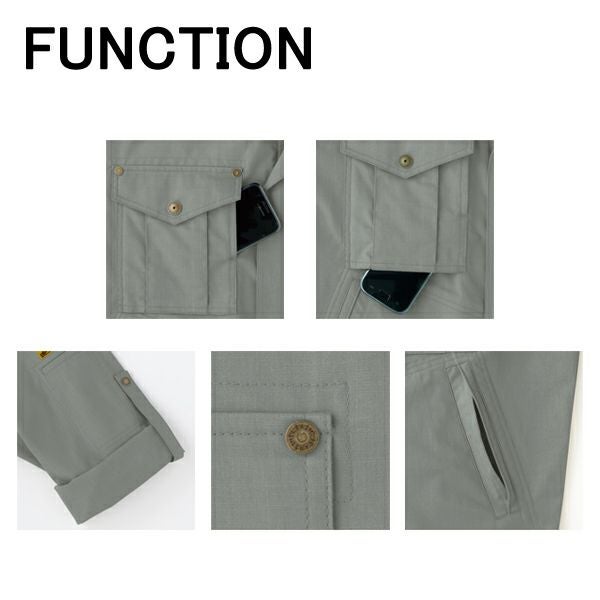 | 特徴 | 1、脇逆玉縁ポケット 2、リベット付 3、ロールアップ 4、K-POCKE(ケーポケ) 5、携帯電話収納ポケット |