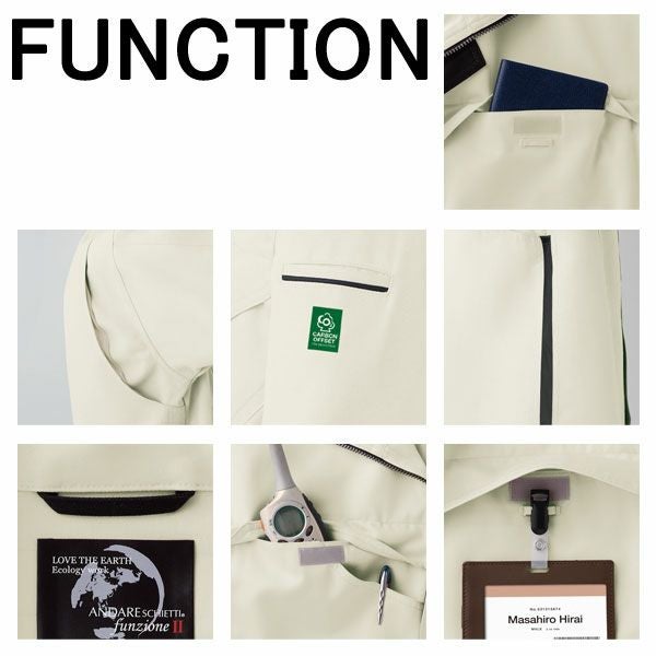 | 特徴 | 1、帯電防止素材使用 2、再生PET繊維50%以上 3、再生繊維使用 4、JIS帯電防止規格合格 5、樹脂ボタン 6、携帯電話収納ポケット 7、男女兼用 8、衿吊りループ 9、右胸マルチポケット 10、IDカード用ループ 11、胸ポケット 12、アクションプリーツメッシュ 13、サイドラジエーター 14、カーボンオフセットマーク |