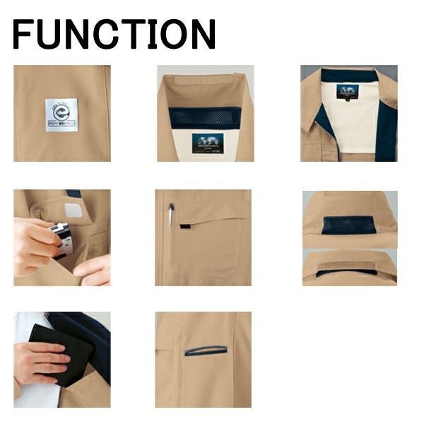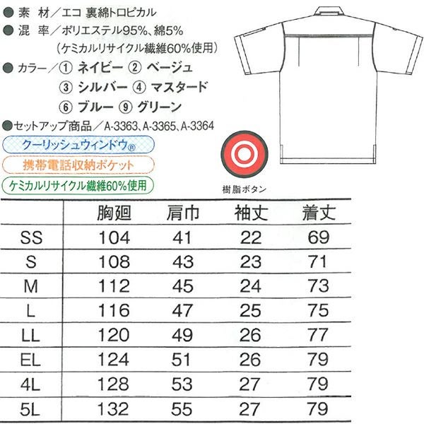 | 特徴 | 1、JIS帯電防止規格合格 2、帯電防止素材使用 3、エコマーク認定 4、再生繊維使用 5、クーリッシュウィンドウ® 6、衿台吸汗速乾メッシュ 7、背当て付(メッシュ) 8、携帯電話収納ポケット 9、両胸ポケット(ペン差し付) 10、反射パイピング付ペン差し 11、エコマーク 12、樹脂ボタン 13、ケミカルリサイクル繊維60%使用 |