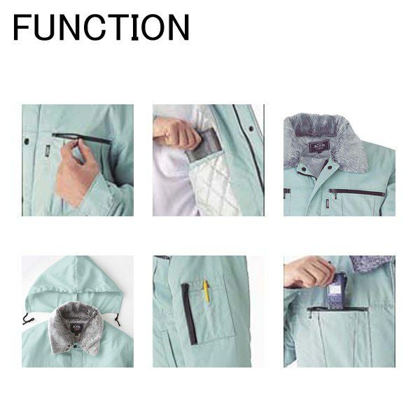 | 特徴 | 1、軽い着心地 2、優れた保温性 3、撥水加工 4、裏地 5、樹脂ファスナー 6、樹脂ボタン 7、衿ボア(着脱可能) 8、便利な内ポケット 9、携帯電話収納ポケット 10、胸ファスナー付ポケット 11、袖ペン差し付ポケット |