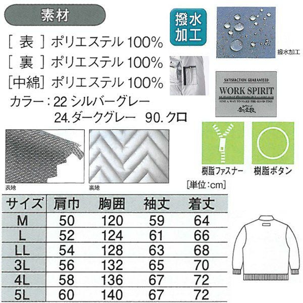 | 特徴 | 1、樹脂ファスナー 2、樹脂ボタン 3、撥水加工 4、便利な内ポケット 5、衿ボア着脱可能 6、携帯電話収納ポケット 7、再帰反射テープ付き 8、便利なマルチポケット(右胸) 9、袖ペン差し |
