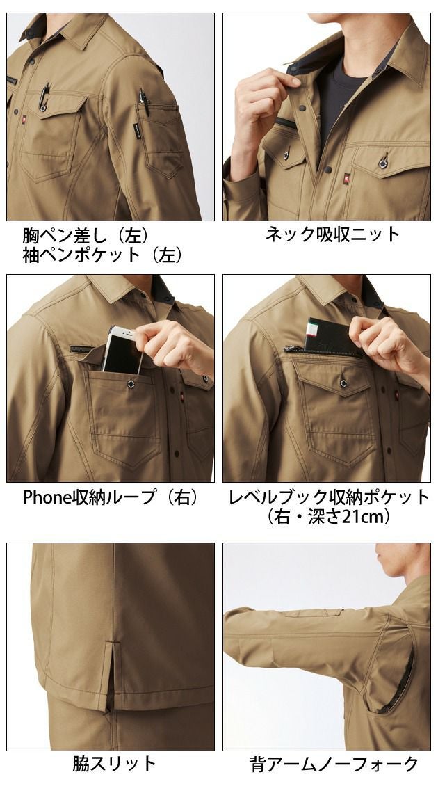 | 特徴 | 伸縮性に優れたスーパーストレッチ素材を使用! 優れた通気性・吸汗性で汗のべたつきを解消するエアリ―クロス素材! ■男女ユニセックス対応 ■製品制電JIS T8118適合品 ■背アームノーフォークメッシュ ■レベルブック収納ポケット(右:深さ約21cm) ■ネック吸収ネット ■袖ダブルペンポケット(左) ■胸ペン差し(左) ■袖アームタック ■Phone収納ループ(右) ■脇スリット ■SS・Sサイズレディース対応シルエット |