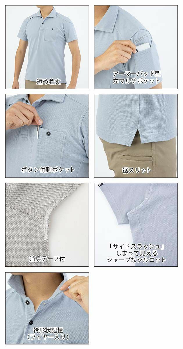 | 特徴 | ハリコシのある綿100%ヘビーウェイト鹿の子を使用した半袖ポロシャツ。 アーマーパッド型ポケットにロゴでアクセントをプラス。 ◆短め着丈 ◆アーマーパッド型左マルチポケット ◆ボタン付胸ポケット ◆裾スリット ◆消臭テープ付 ◆サイドスラッシュにより、しまって見えるシャープなシルエットに ◆衿形状記憶(ワイヤー入り) ◆SS・Sはジャストフィットシルエット |