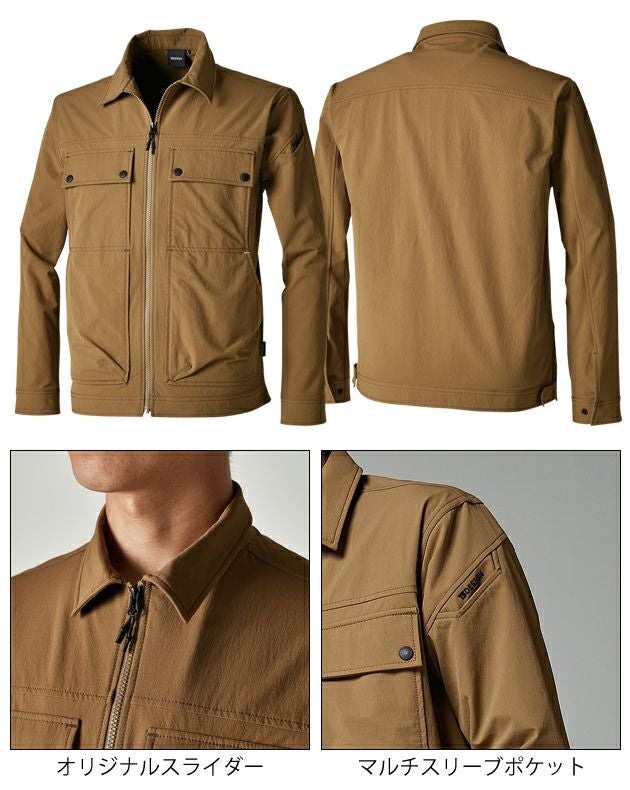 | 特徴 | 高耐久素材コーデュラ(R)素材使用。ストレッチ性も抜群で幅広いフィールドで活躍 ◆高耐久で全方位に伸びるストレッチ素材 独自開発素材「TS4Dコーデュラナイロン」は高耐久素材でありながら、タテ・ヨコに伸びる高いストレッチ性を持つ。 ワークシーンでのあらゆる動きをサポートする。 ◆両胸にボタンフラップ付きのポケット 小物類であれば十分収納できるスペースを確保した胸ポケットを付けてある。 ボタンフラップ付きなので貴重品を落とす心配もない。 ◆マルチスリーブポケット 左袖にはブランドのアイコン的なポケット「マルチスリーブポケット」を採用。 ロゴプリントはラバープリントを採用。両脇にはサイドポケットが付いている。 ・強度とストレッチ性(経:27.4%、緯:15.6%)を併せ持つ ・縫製糸により静電気もケアしている ・二重織組織により肌面が点接触で快適に着られる ・オリジナルスライダー ・ロゴネーム付き内ポケット ・内ポケット |