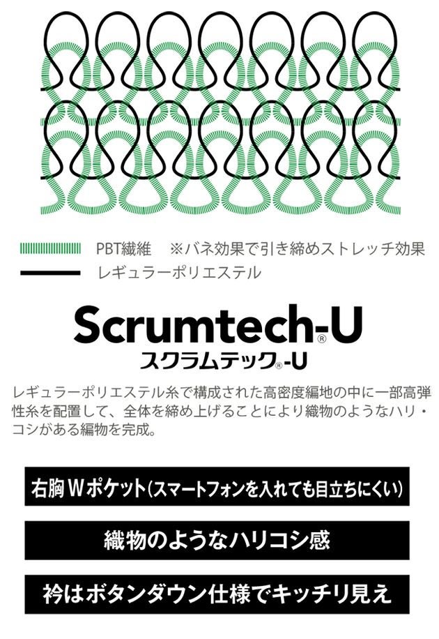 | 特徴 | 新次元の軽さ×全方向ストレッチ! ウルトラストレッチポロシャツ! ◆ワーキングウェアに最も重要な要素の一つである、ストレスフリーを実現する新次元のストレッチ素材(スクラムテック-U)を採用。 高弾性糸を締め上げ、高密度に編み上げることで高いストレッチ性を獲得。 すぐれた保形性とおどろくほどのしなやかさ、美しい表面感を持ち、丈夫で、軽く、さらに防汚・帯電防止の機能がウルトラストレスフリーなワーキング環境を実現します。 ◆スーパーストレッチ 全方向ストレッチ素材がストレスフリーな着心地を実現。 ◆ストレッチ素材 新次元の軽さとしなやかさを持つ高強度ニット素材を採用。 ◆タフな生地 ◆ファスナー付胸ポケット ◆ペン差し付(左袖) ◆裾/スリット ◆帯電防止(JIST8118適合) ◆吸汗速乾 ◆防汚 ◆UVカット ◆男女兼用 |