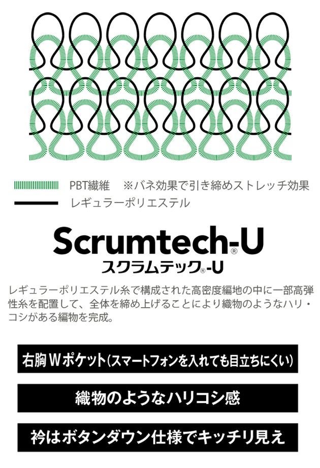 | 特徴 | 新次元の軽さ×全方向ストレッチ! ウルトラストレッチポロシャツ! ◆ワーキングウェアに最も重要な要素の一つである、ストレスフリーを実現する新次元のストレッチ素材(スクラムテック-U)を採用。 高弾性糸を締め上げ、高密度に編み上げることで高いストレッチ性を獲得。 すぐれた保形性とおどろくほどのしなやかさ、美しい表面感を持ち、丈夫で、軽く、さらに防汚・帯電防止の機能がウルトラストレスフリーなワーキング環境を実現します。 ◆スーパーストレッチ 全方向ストレッチ素材がストレスフリーな着心地を実現。 ◆ストレッチ素材 新次元の軽さとしなやかさを持つ高強度ニット素材を採用。 ◆スリム半袖口 袖口は二の腕に沿うようにスリムな形状でばたつかず、大きく開かないので腋下や下着が見えにくく安心。 ◆ファスナー付胸ポケット ◆ペン差し付(左袖) ◆裾/スリット ◆帯電防止(JIST8118適合) ◆吸汗速乾 ◆防汚 ◆UVカット ◆男女兼用 |