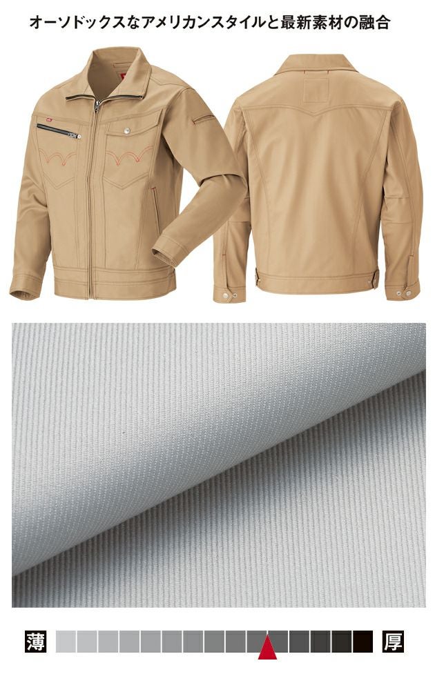 | 特徴 | オーソドックスなアメリカンスタイルと最新素材の融合! ◆胸ポケットから伸びる立体的なV字状シーム(切り替え)と、ウエスタン背ヨークというオーソドックスなスタイルながら伸縮率約7%のT/C素材! ◆肘のダーツ、メタル調の胸ファスナー、Wステッチマーク入り胸ポケットのユーティリティ・ブルゾン! ◆オールシーズン対応! ◆日本製生地 ◆帯電防止素材 ◆ストレッチ素材(伸縮率約7%) ◆フロント:金属ファスナー ◆右胸:樹脂ファスナー ◆左胸:金属ドットボタン ◆内ポケット(左身頃) |