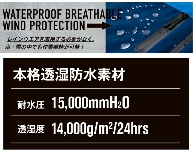 【特徴】 レインウェアを着用する必要がなく、雨・雪の中でも作業継続が可能!