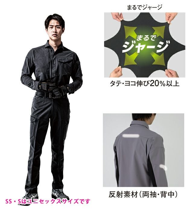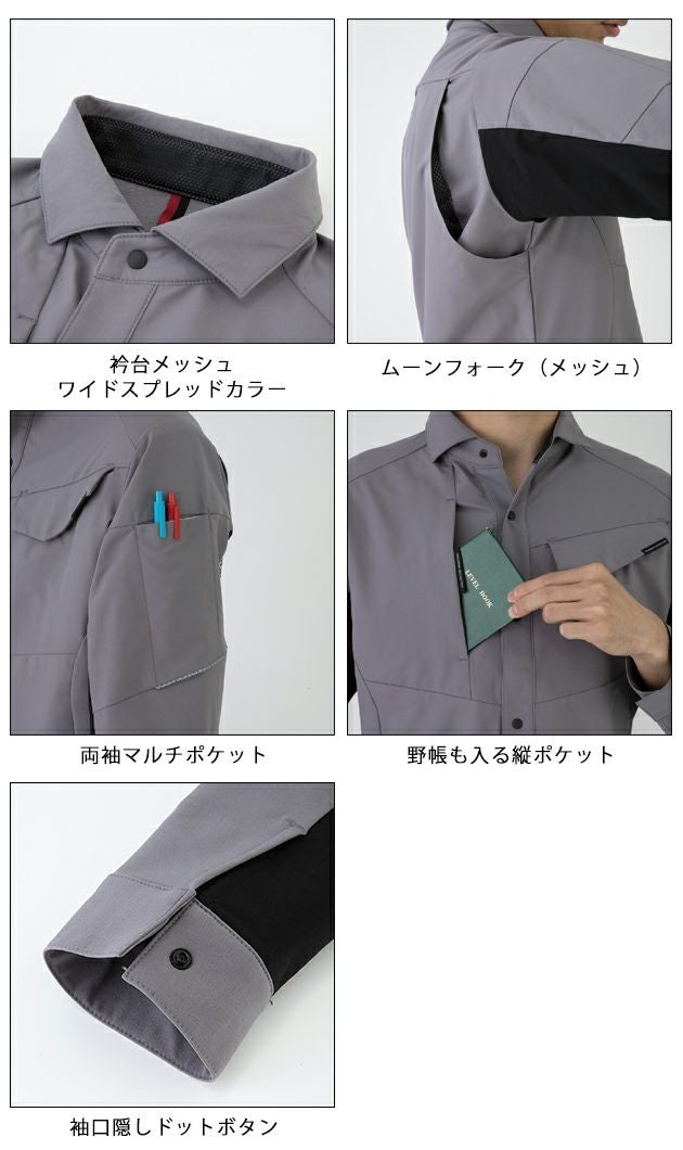 | 【特徴】 | コーコス史上最軽量&最伸長で、ライトな着心地は「まるでジャージ」。 マルチスペックな高機能を兼ね備え、ワークウェアのNEOスタンダードを体現したシリーズ。 20周年記念モデル。 ◆軽量4WAYストレッチ伸長率タテ・ヨコ20%以上、「まるでジャージ」のような軽量で快適な素材を使用 ◆JIS T 8118適合:JIS T 8118適合のため不快な静電気を軽減し快適な着心地をサポート ◆両マルチポケット両袖にあることで、利き腕に左右されない使いやすさを実現 ◆豊富な胸ポケット:野帳が入る右胸ポケットや、フラップをスムーズに収納できる左胸フラップインポケットなど多彩なポケット仕様 ◆反射反射素材で夜間屋外で働く方の視認性をキープ(両袖・背中) ・反射素材(両袖・背中) ・両袖マルチポケット ・野帳も入る縦ポケット ・ムーンフォーク(メッシュ) ・衿台メッシュ ・ワイドスプレッドカラー |