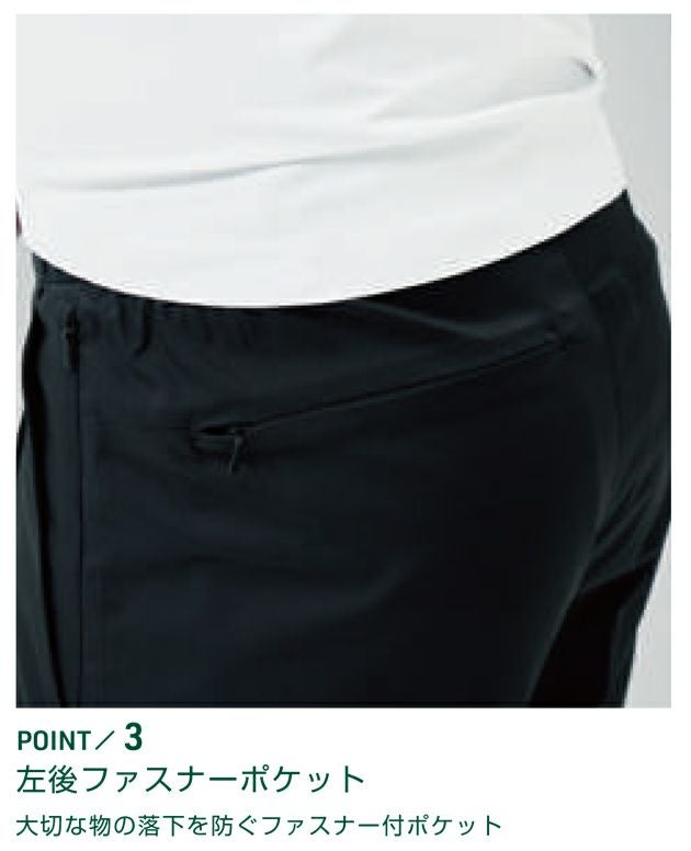 【特徴】 適度な生地厚と着心地の良い伸び感のある素材を使用し、1プリーツやウエストサイドにゴムを入れる事で更に快適な着心地を実現。