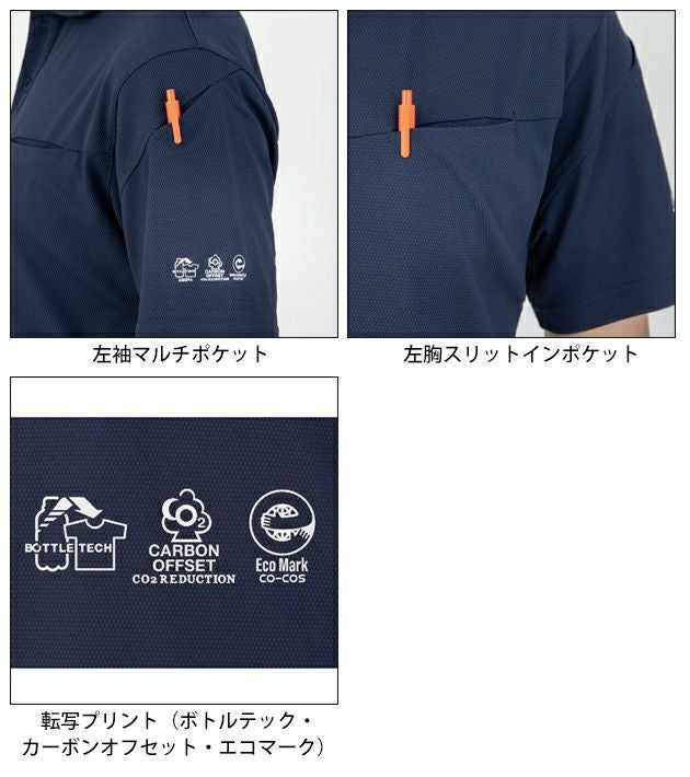 | 【特徴】 | ◆エコ素材 再生PET素材を使用することでユニフォームを着るだけで環境活動に貢献 ◆ニオイクリア(R)EX 特殊化学結合した消臭糸を使用。実感レベルの消臭力を半永久的に実現 ◆鬼鹿の子 肉厚生地によるタフさと、ドライで通気性に優れた鹿の子生地 ◆汗ジミ防止 脇部分の汗ジミを抑える汗取りパッド付き 脇ぐりの生地を2重にすることで、脇汗をしっかりキャッチ。 脇部分への汗ジミを抑えます。 ◆UVカット 紫外線遮蔽率97%のUVカット素材で日焼けから肌をガード ◆Xラインシルエット 体形にメリハリをつけ、ボディラインをすっきり見せるXラインシルエット ◆エコプリント ボトルテック・カーボンオフセット・エコマークのプリント入りで、着用するだけで環境活動へ寄与 ・左胸スリットインポケット ・左袖マルチポケット |
