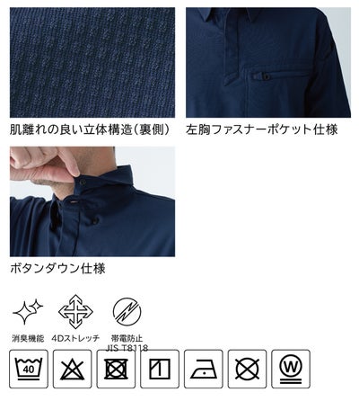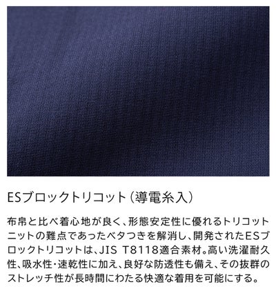 | 【特徴】 | JIS T8118規格適合の「静電気帯電防止作業服」 ベタつきを解消したドライポロシャツ ◆ESブロックトリコット(導電糸入) 布帛と比べ着心地が良く、形態安定性に優れるトリコットニットの難点であったベタつきを解消し、開発されたESブコックトリコットは、JIS T8118適合素材。 高い洗濯耐久性、吸水性・速乾性に加え、良好な防透性も備え、その抜群のストレッチ性が長時間にわたる快適な着用を可能にする。 ◆肌離れ性 ◆防透性 ◆消臭性 ◆形態安定性 ・肌離れの良い立体構造(裏側) ・左胸ファスナーポケット仕様 ・ボタンダウン仕様 |