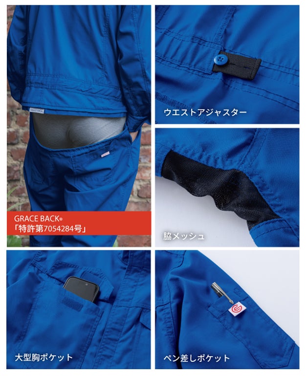 | 【特徴】 | 夏でも GRACE BACK(R)デビューを応援! 一度着ると他のツナギには戻れない便利なヒップオープン機能『GRACE BACK(R)』付きでもお求めやすいプライスで人気なオールマイティーツナギの夏用モデル。 カラバリもサイズも通年モデル(GE-830)と共通ですので、会社やチーム皆で揃えてのユニフォーム使いも年中可能のオールマイティーなツナギです。 ・ウエストアジャスター ・大型胸ポケット ・GRACE BACK(R)「特許第7054284号」 ・脇メッシュ ・ペン差しポケット |