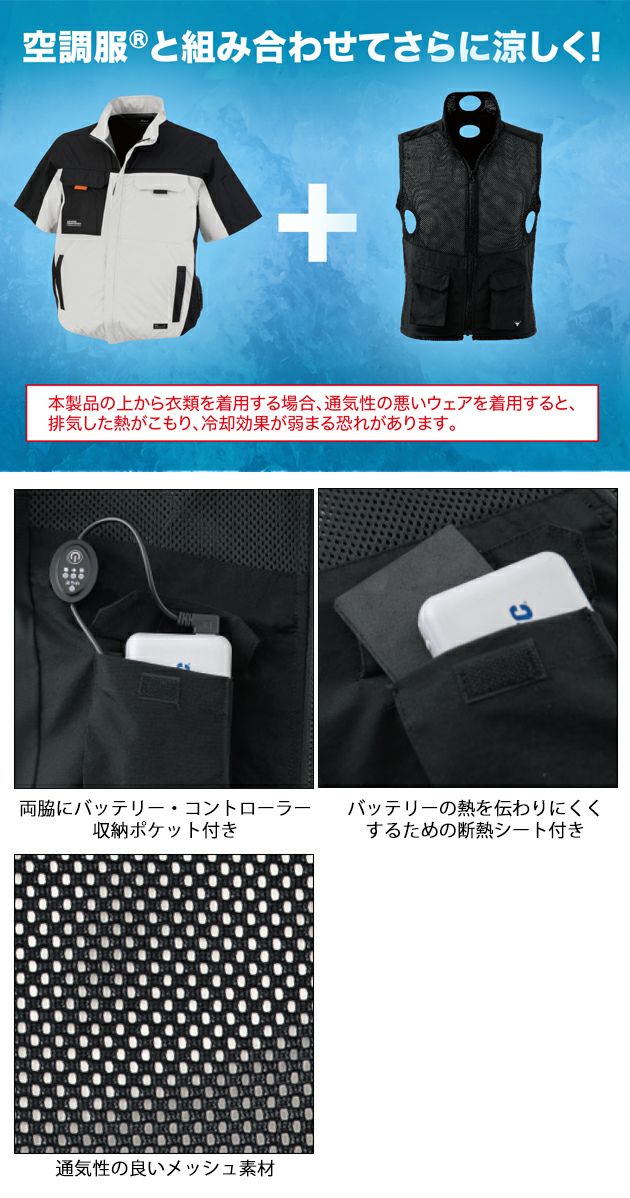 | 【特徴】 | 次世代冷却ベストで酷暑を乗り切れ! ペルチェ素子であっという間に冷却!!自分の冷やしたい所に装着できる!!バッテリー交換だけで時間長持ち冷却!! スイッチを入れて約10秒であっという間に冷える「ペルチェ素子」。 ベスト型のジャケットと首裏と両脇下にペルチェを配置して、効率的に身体を冷やします。 ベストの素材はメッシュとニットで伸縮性が高く着用時のストレスを軽減、さらに身体に密着してひんやり感をアップさせます。 軽量で持ち運びがしやすいためレジャー、アウトドアなどシーンを選ばずご着用いただけます。 ◆両脇にバッテリー、コントローラー収納ポケット付き。 ◆バッテリーの熱が伝わりにくくするための断熱シート付き。 ◆ペルチェ素子で効率的に冷却(最大6つ装着可能) ◆8サイズ展開で様々な体型に合わせて着用 ◆身頃メッシュでムレにくい ◆自分の冷やしたい所に装着できる身体にフィットするストレッチ素材 ◆お手持ちのモバイルバッテリー使用可能 ◆最大6個装着可能!追加装着でさらに涼しく! ※追加でデバイスを装着する場合は、デバイスとバッテリーが必要です。 ◆空調服(R)と組み合わせてさらに涼しく! ※本製品の上から衣類を着用する場合、通気性の悪いウェアを着用すると、排気した熱がこもり、冷却効果が弱まる恐れがあります。 [セット内容] ・ペルチェ専用メッシュベスト×1 ・ペルチェ冷却デバイス×1 ・リチウムイオンバッテリー×1 ・充電コード×1 ・取扱説明書×1 ・断熱シート×2 ※ACアダプターは付属しておりませんので市販のものをお使いください。 左右脇ポケット(巾9cm×深さ13.5cm) 〈バッテリー本体〉 外形寸法:高さ約91×幅約63×厚み約23(mm) 製品重量:約185g 内蔵電池:リチウムイオン電池 電池容量:10,000mAh 入力電圧:DC5V/2A(MAX) 出力電圧:DC5V/2.1A(MAX) 充電時間:2A使用時約6時間 充放電回数:約300回 |