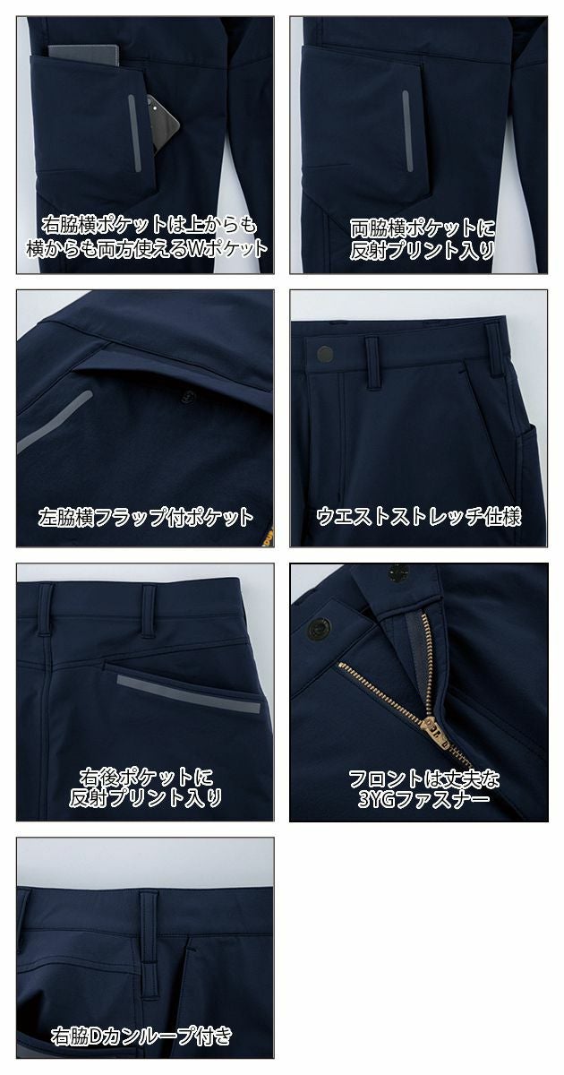 | 特徴 | ストレスフリーな2WAYストレッチ! 摩耗や引き先に強いコーデュラナイロンを採用。 あらゆる動きをサポートする2WAYストレッチで快適な着心地を実現。 ◆スタイリッシュなデザイン ◆右脇横ポケットは上からも両方使えるWポケット ◆両脇横ポケットに反射プリント入り ◆左脇フラップ付きポケット ◆ウエストストレッチ仕様 ◆右後ろポケットに反射プリント入り ◆フロントは丈夫な3YGファスナー ◆右脇Dカンループ付き |