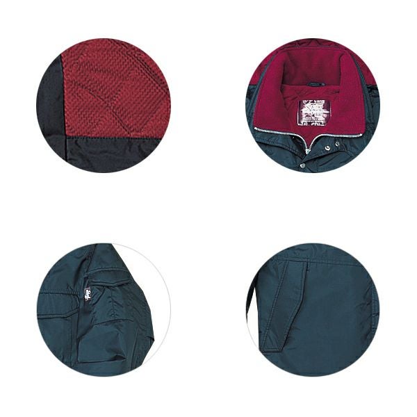 1、フードアジャスター 2、胴裏 3、衿フリース仕様 4、二重衿仕様 5、持ちやすいファスナースライダー 6、ワンポイント 7、携帯電話収納ポケット 8、内ポケット 9、左袖機能ポケット(ペン差付) 10、肘タック 11、オリジナルデザインボタン 12、袖口アジャスター 13、裏縫い目止め、目張り加工 14、裾ヌレ防止折り返し仕様 15、撥水加工 16、透湿防水 17、防寒 |