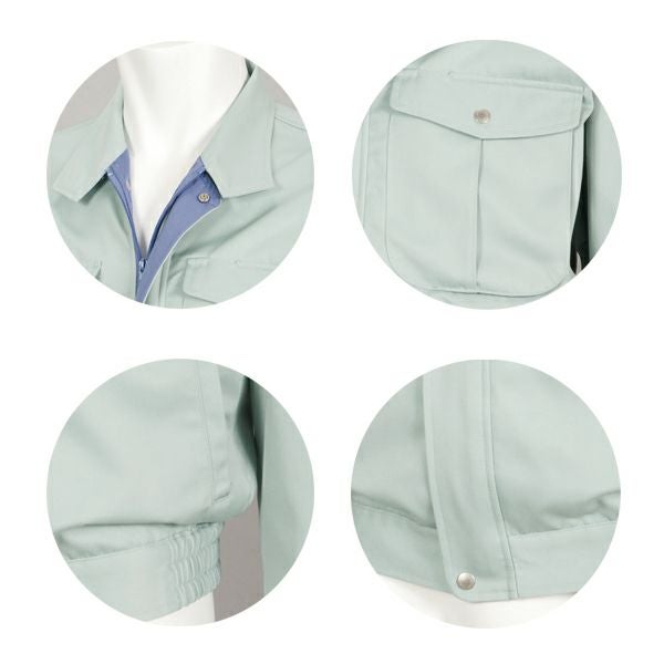 1、右胸携帯電話入ポケット 2、マチ付ポケット 3、氏名片布 4、衿見返し配色 5、左袖・左胸ペン差し 6、金属ボタン 7、楽WORK仕様 8、帯電防止素材使用 9、形態安定性 |