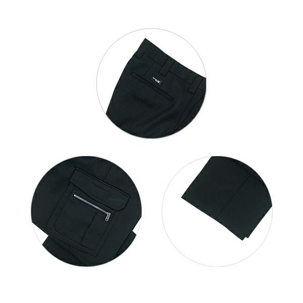 1、コインポケット 2、携帯電話ポケット 3、右カーゴポケット内携帯ホルダー 4、小銭がちらばらないコインポケット 5、制電 6、ソフト加工 7、速乾 8、イージーアイロン |
