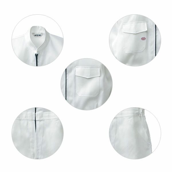 1、強力三重環縫 2、腰帯脇ゴム仕様 3、袖口(カフス)、胸ポケットフラップ/マジックテープ 4、フロントファスナー/コイル(スライダー:金属) 5、ペン差し/左袖 6、前開き部分、濃紺ファスナー使用 7、マジックテープ使用 8、ロングセラーのホワイト 9、胸ポケットマジックテープ |