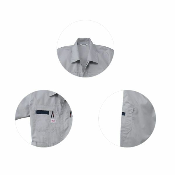 1、ズポンサイドポケットフラップ、腰帯脇尾錠、帯持出し/マジックテープ 2、フロントファスナー/コイル(スライダー:金属) 3、胸ポケットファスナー/コイル(スライダー:金属<オートバイロゴ入り黒テープ引き手付>) 4、背中ノーフォーク仕様 5、ペン差し/左袖 6、パンツ部/1タック 7、ストライプのパターンが斬新 8、帯電防止 9、引きつり軽減 10、カラー豊富 11、開衿タイプ 12、胸ポケットファスナー |